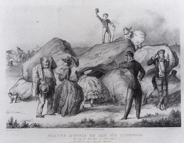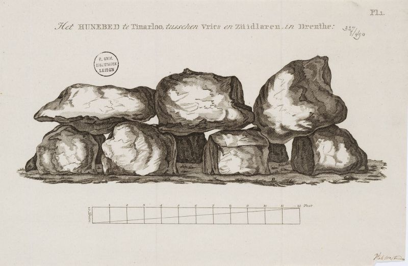 Boven aan de pagina; schoolplaat Het hunebed bij Tynaarloo naar aquarel in 1905 door W. Roelofs
